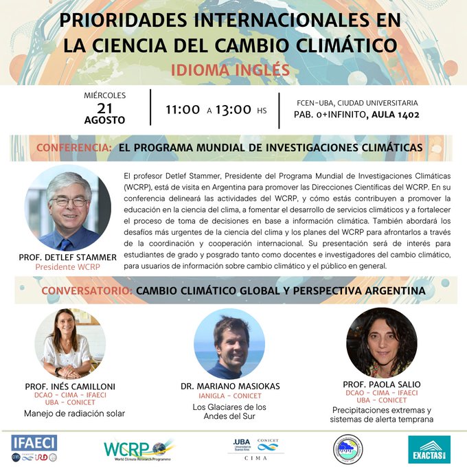 Este evento, inicialmente propuesto en modalidad presencial en la FCEN-UBA, estuvo dirigido a estudiantes, docentes, investigadores y personal de los servicios meteorológicos e hidrológicos nacionales. Debido al paro del personal universitario (anunciado oficialmente el 19 de agosto) en rechazo a la fuerte reducción del presupuesto de las universidades públicas argentinas, el evento se realizó de manera virtual.El profesor Detlef Stammer presentó una visión general de la crisis climática global y del WCRP. Por su parte, tres investigadores argentinos ofrecieron exposiciones más breves sobre temas de alta relevancia: la profesora Inés Camilloni sobre la gestión de la radiación solar; el Dr. Mariano Masiokas sobre el estado actual y el futuro de los glaciares argentinos; y la profesora Paola Salio sobre eventos extremos y sistemas de alerta temprana.